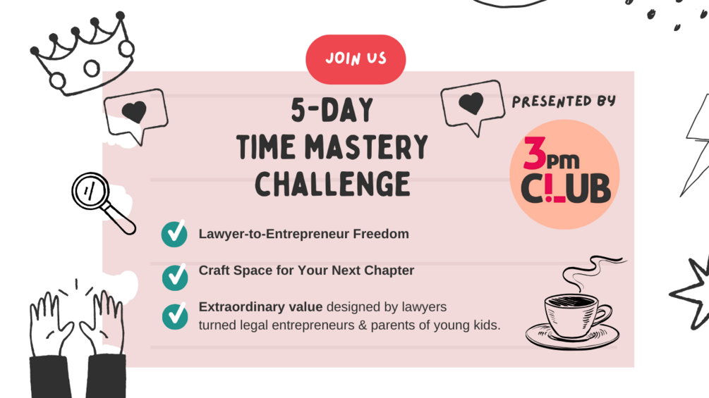 ⏳ 5-Day Time Mastery Accelerator ⏳Lawyer-to-Entrepreneur Freedom Challenge 🚀 Crafting Space for Your Next Chapter 🌟 Extraordinary value, designed by former lawyers turned legal entrepreneurs & parents of young kids
